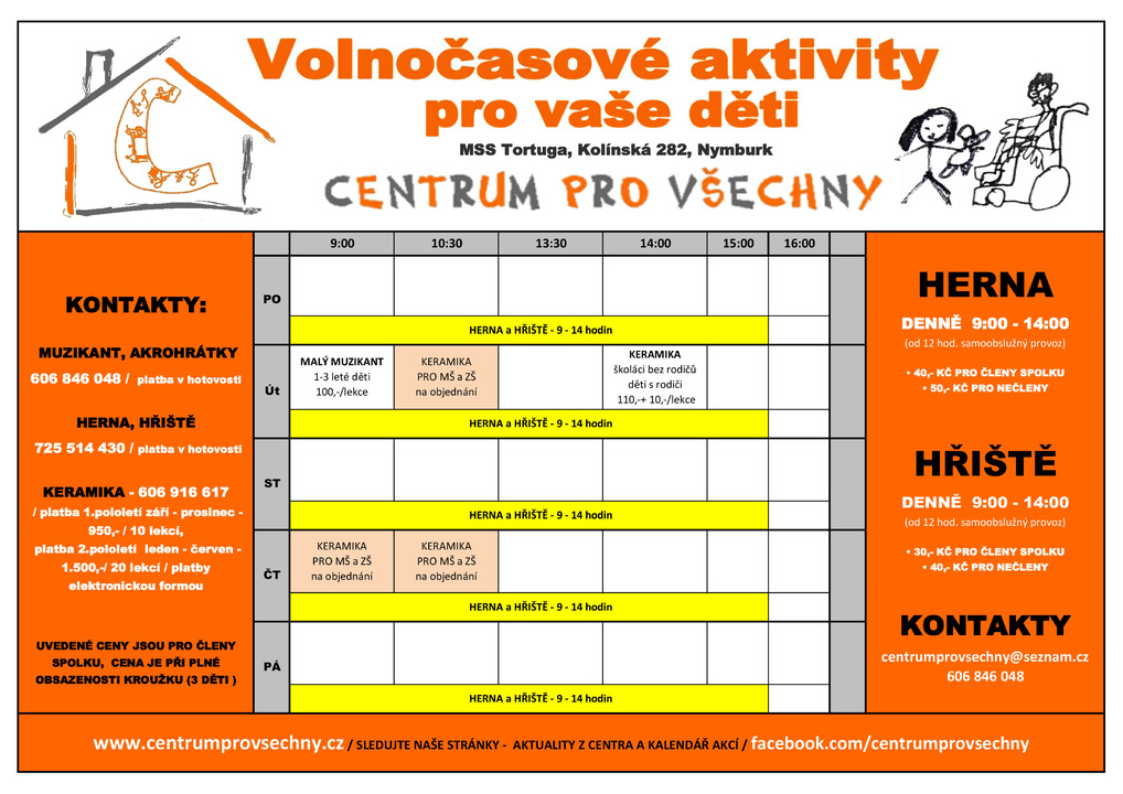 Centrum je možné navštěvovat jak pravidelně, tak jednorázově. Můžete se například přijet podívat třeba jen na Dětský den nebo si pohrát na Hřišti.