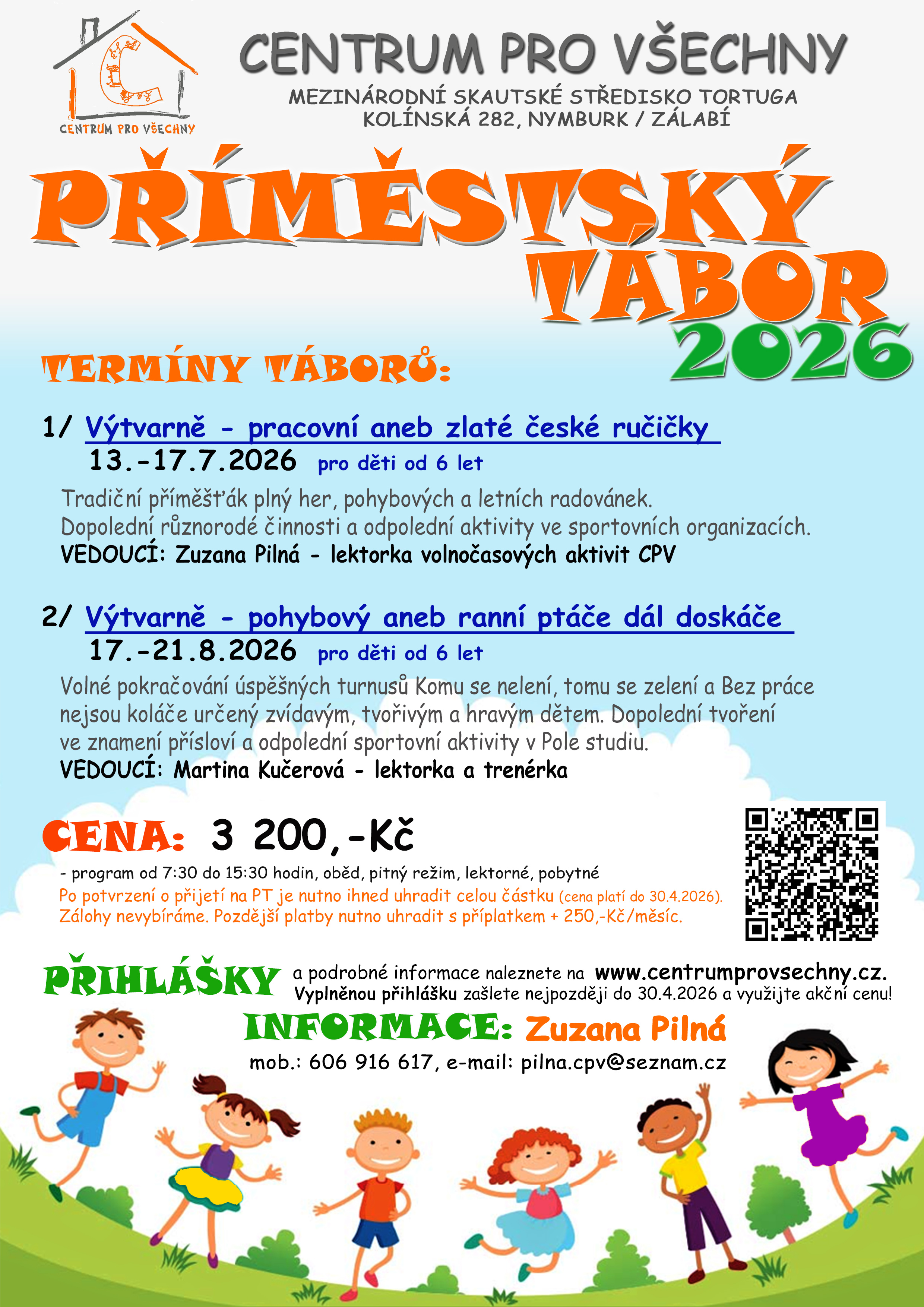 Podrobné informace najdete na letáčku a v přihlášce. Přihlášky na příměstské tábory jsou ke stažení v záložce Dokumenty ke stažení, nebo po domluvě k vyzvednutí na MSS Tortuga, Kolínská 282, Nymburk.