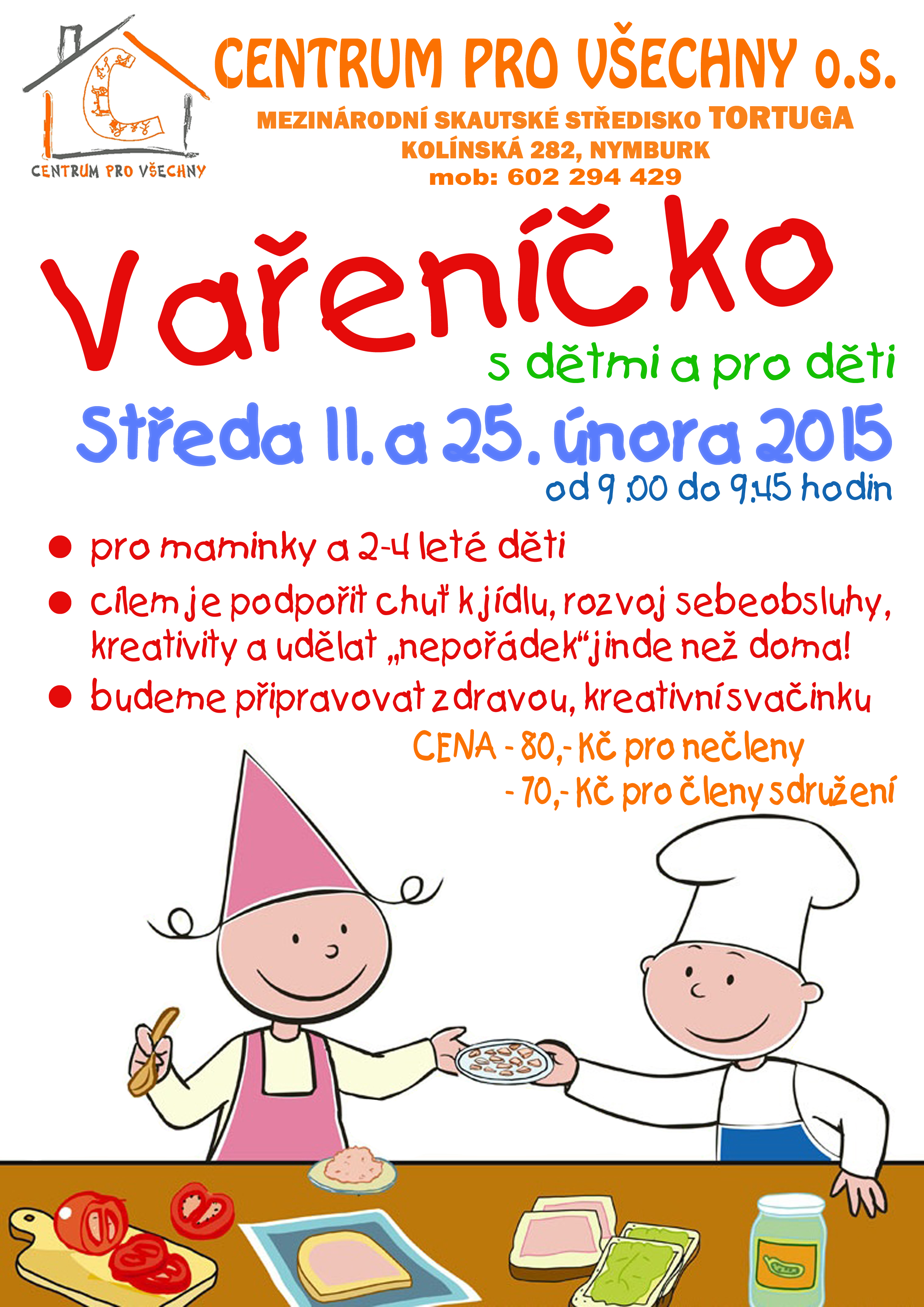 Cílem je podpořit u dětí chuť k jídlu, rozvoj sebeobsluhy, kreativity a udělat "nepořádek" jinde než doma!. Cena kroužku je 80 Kč pro nečleny a 70 Kč pro členy sdružení.