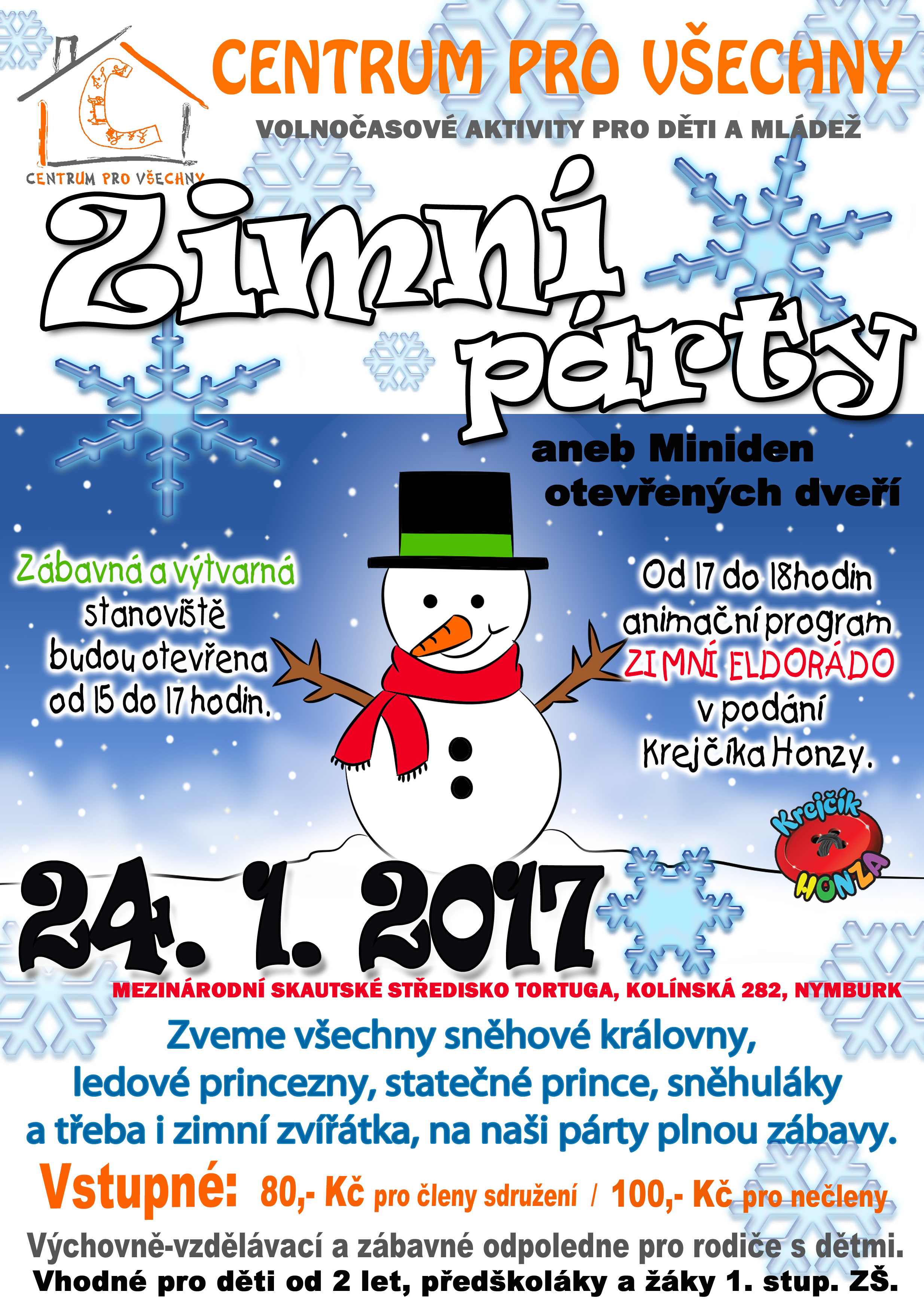 Tentokrát na téma zimních radovánek, od 15 do 17 hodin budou otevřena výtvarná a zábavná stanoviště, od 17 hodin bude navazovat zábavný animační program ZIMNÍ ELDORÁDO s Krejčíkem Honzou.