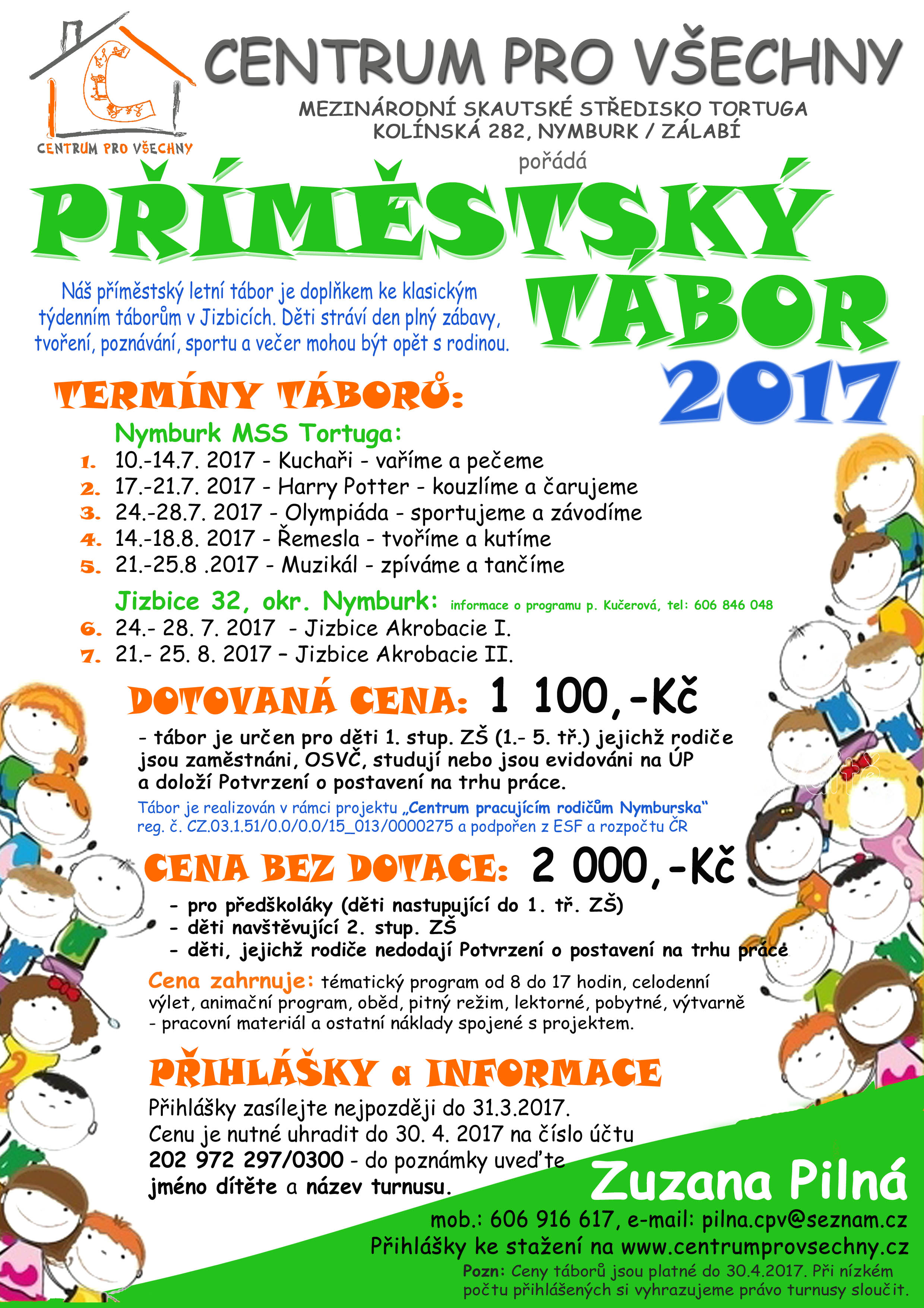 Dotovaná cena: 1100,- Kč za dítě (1. stup. ZŠ - 1.- 5. tř.) Je nutné odevzdat potvrzení osob, které pečují o dítě ve společné domácnosti o Postavení na trhu práce (s červnovým aktuálním datem). Tábor je organizován jako aktivita projektu Centra pro všechny „Centrum pracujícím rodičům Nymburska“, registrační č. CZ.03.1.51/0.0/0.0/15_013/0000275, který je finančně podpořen z Evropského sociálního fondu a rozpočtu ČR (dále OPZ).
