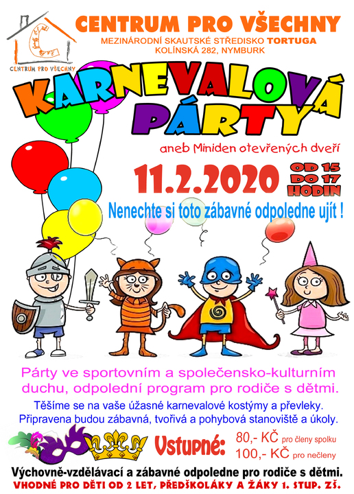11. 2. 2020 Karnevalová párty - Miniden otevřených dveří neboli Párty - zveme vás na tematicky laděné odpoledne plné naučně-zábavných a výtvarných stanovišť. Přijďte si s dětmi užít zábavné odpoledne. Těšíme se na vaše úžasné karnevalové kostýmy a převleky. Připravena budou zábavná, tvořivá a pohybová stanoviště a úkoly. V úterý od 15 do 17 hodin na MSS Tortuga, vhodné pro rodiny a děti od 2 do 10 let., vstupné 80,-Kč pro členy CPV, 100,- Kč pro nečleny.