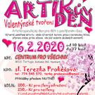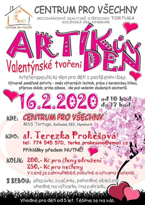 16. 2. 2020 Artíkův den - jednodenní arteterapeutický den od 10 do 17 hodin u nás na provozovně Kolínská 282, Nymburk. Zábava s kamarády, tvoření, výtvarka, keramika, příprava oběda a další. Přihlášky předem nutné! Kontakt: Terezka Prokešová, mob.774 545 570, e-mail: terka.prokesova@email.cz.