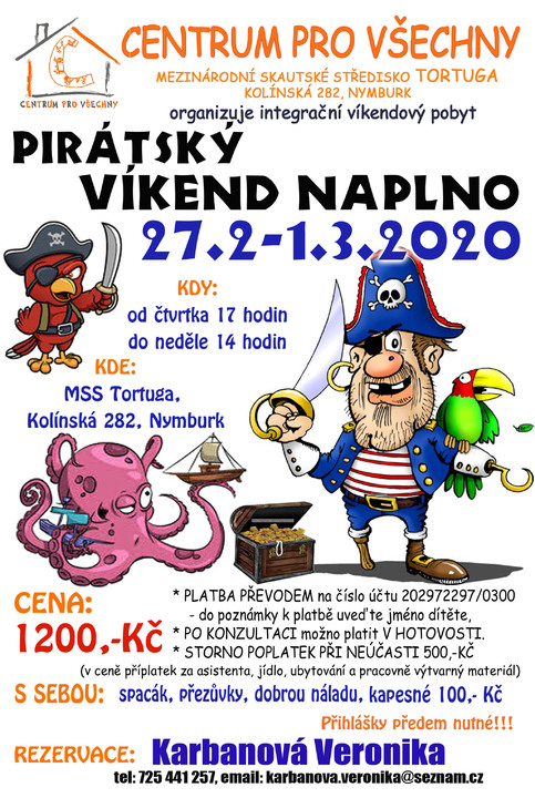 27. 2. 2020 - 1. 3. 2020 Víkend naplno - je integrační víkendový pobyt, v rámci výletu se výtvarničí, sportuje, výletí, vzdělává, relaxuje, hrají společenské hry, prostě se jede naplno. Informace na plakátku. Přihlášky předem nutné! Kontakt: Veronika Karbanová, tel. 725 441 257, karbanova.veronika@seznam.cz.