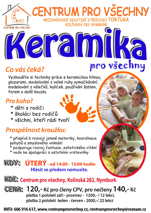 Děti si vyzkouší a osvojí techniky práce s keramickou hmotou. Tématicky výtvarničíme dle aktuálního ročního období, svátků či na přání. Vytváříme výrobky modelováním, válením, vykrajováním, lepením, obtiskováním a dozdobujeme jak glazurou, tak engobou, rádi používáme i oxidy pro zvýraznění struktur a kresby do hlíny. A co teprve barevná sklíčka, to se pak keramická kočička může pochlubit svýma blýskavýma očičkama...